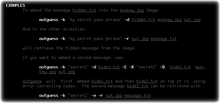 OutGuess универсальный стенографический инструмент, позволяющий осуществлять вставку скрытой информации извлекая избыточные биты из изображения, подменяя их на последовательность битов с скрываемой информацией, максимально минимизируя количество изменений основных данных. Поддерживается работа с изображениями форматов JPEG и PNM (.ppm, .pgm, .pbm или .pnm).